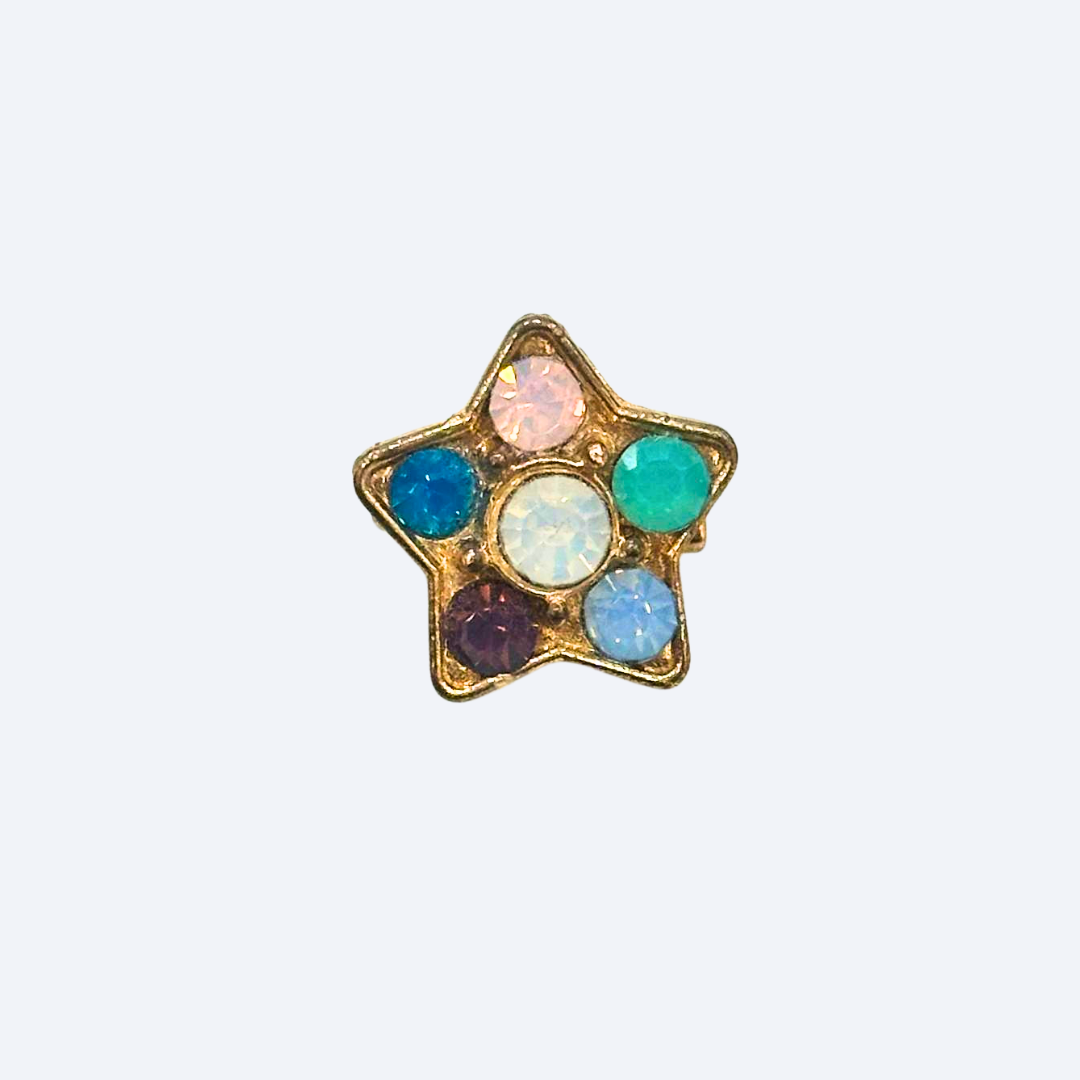 A five-pointed gold-tone star featuring multi-colored stones (teal, blue, purple, pink) surrounding a central white stone.
