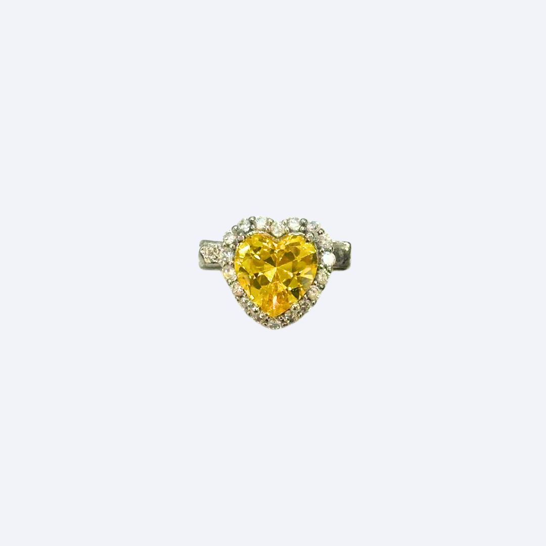 A heart-shaped yellow stone surrounded by a halo of smaller clear crystals.