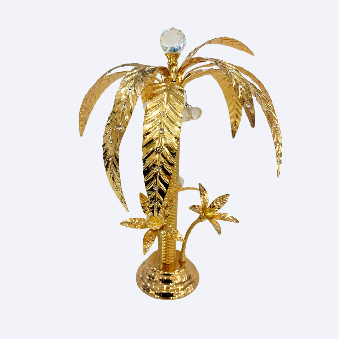 Bring a touch of glamorous tropical flair to your decor with this striking palm tree figurine. Crafted with a brilliant gold-tone finish, this piece captures the essence of an exotic paradise while offering unparalleled luxury.