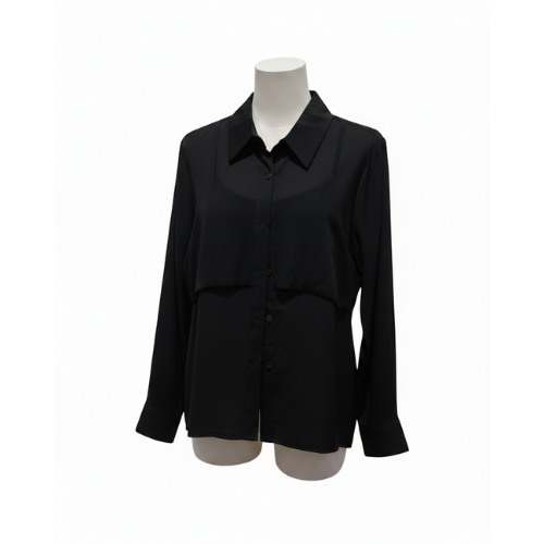 This buttoned down features a unique layered aesthetic, blending a classic collared structure with a modern, draped overlay for a sophisticated silhouette. Crafted from a fluid, lightweight fabric, it offers a seamless transition from professional daywear to evening elegance..