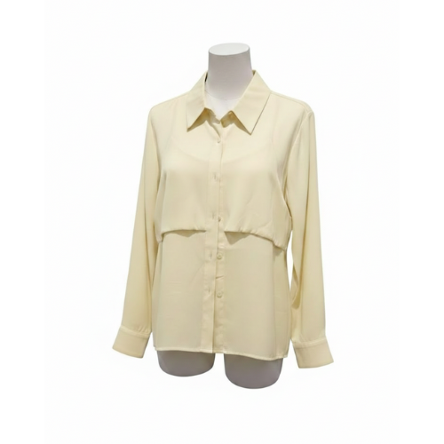 This buttoned down features a unique layered aesthetic, blending a classic collared structure with a modern, draped overlay for a sophisticated silhouette. Crafted from a fluid, lightweight fabric, it offers a seamless transition from professional daywear to evening elegance..