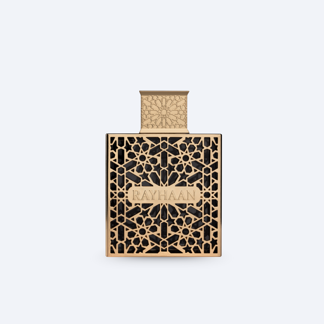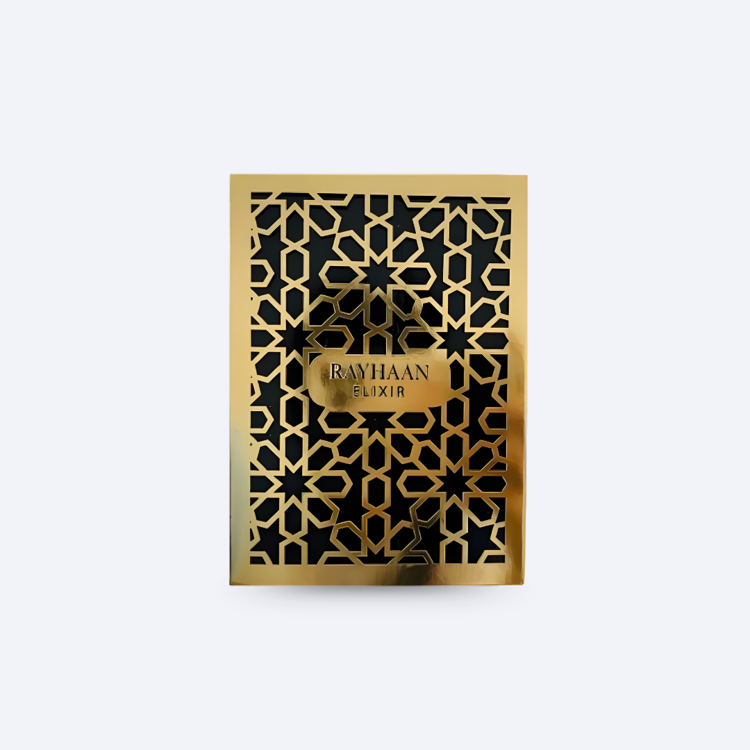 Presenting RAYHAAN ELIXIR. The latest AROMATIC AMBERY WOODY creation by Rayhaan Perfumes! This powerful scent ignites your feelings adding a sensual touch at its base. Starting with a zesty citrusy note fueled by minty freshness, the fragrance quickly unveils its richness of lavender and benzoin complimented with accents of sweet vanilla. Trumped with warm notes of tonka beans in between addictive notes of honey and tobacco, the culmination is as rich as the beginning.  The gold is symbolic of divinity and power; a perfect look to the perfect scent!
